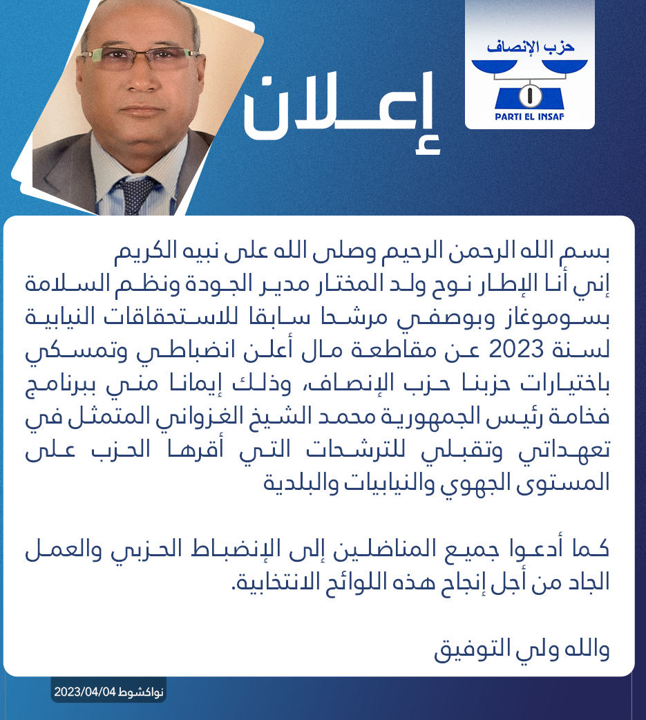 إني أنا الإطار نوح ولد المختار مدير الجودة ونظم السلامة بسوموغاز وبوصفي مرشحا سابقا للاستحقاقات النيابية لسنة 2023 عن مقاطعة مال أعلن انضباطي وتمسكي باختيارات حزبنا حزب الإنصاف، وذلك إيمانا مني ببرنامج فخامة رئيس الجمهورية محمد الشيخ الغزواني المتمثل في تعهداتي وتقبلي للترشحات التي أقرها الحزب على المستوى الجهوي والنيابيات والبلدية