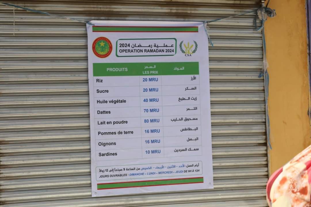 وتشمل عملية رمضان لهذا العام فتح 35 مركزا للبيع بسعر مدعوم، 20 منها في العاصمة، و15 مركزا في عواصم الولايات الداخلية، وذلك لتوفير المواد الغذائية الأساسية للصائمين بأسعار مدعومة، وتتكون السلة الغذائية الموفرة من خلال هذه المراكز من 25 كلغ من السكر، و25 كلغ من الأرز، و25 كلغ من البطاطس، و25 كلغ من البصل، و5 ليتر من زيت الطهي، و3 كلغ من مسحوق الحليب، وكلغ واحد من التمر، و10 علب من سمك السردين، وذلك مقابل مبلغ مالي إجمالي قدره 2410 أوقية جديدة.