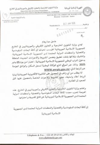 كشفت زارة الشؤون الخارجية و التعاون الإفريقي و الموريتانيين في الخارج في مذكرة موجهة للبعثات الدبلوماسية و القنصلية و المنظمات الدولية العاملة بموريتانيا، رسميا أمس الجمعة عن شروط وإجراءات جديدة للمسافرين الأجانب الراغبين في دخول الأراضي الموريتانية.