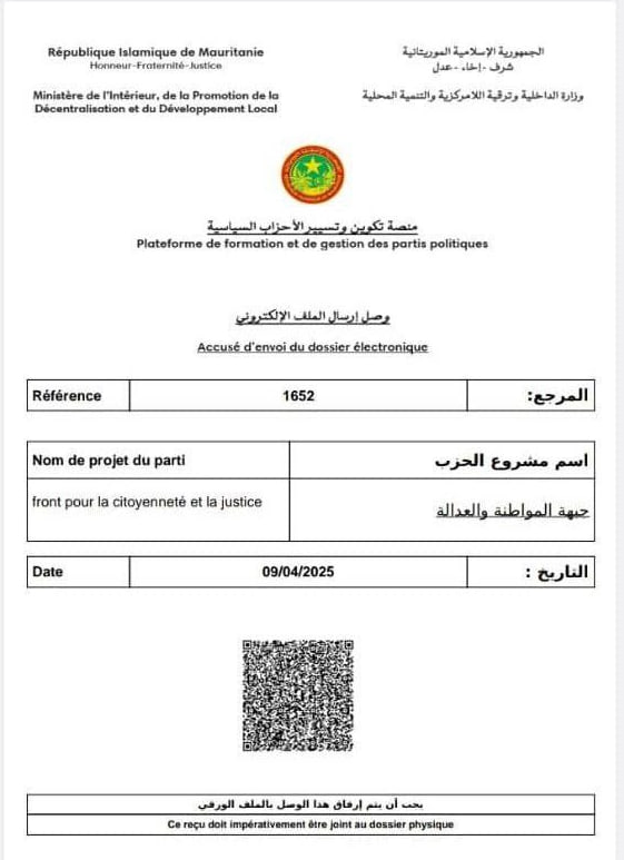 وقد تمت اليوم الأربعاء 09/04:/2025 مراسم تسليم الملف الورقي بحضور وفد رسمي من قيادة جبهة المواطنة والعدالة، يرأسه محمد جميل منصور، وتضمنت المراسم تسليم النصوص الأساسية للحزب إلى مدير الشؤون السياسية والحريات العامة بوزارة الداخلية واللامركزية والتنمية المحلية، دحمان ولد بيروك.