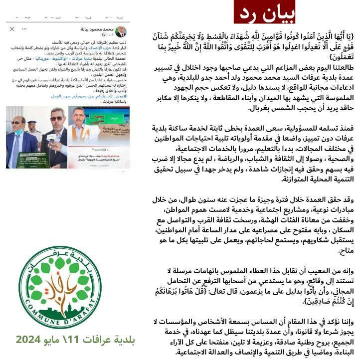 جاء ذلك في رد نُشر على صفحتها بـ”فيسبوك”، على ما وصفته ببعض المزاعم التي يدعي صاحبها وجود اختلال في تسيير عمدة بلدية عرفات السيد محمد محمود ولد أحمد جدو للبلدية.