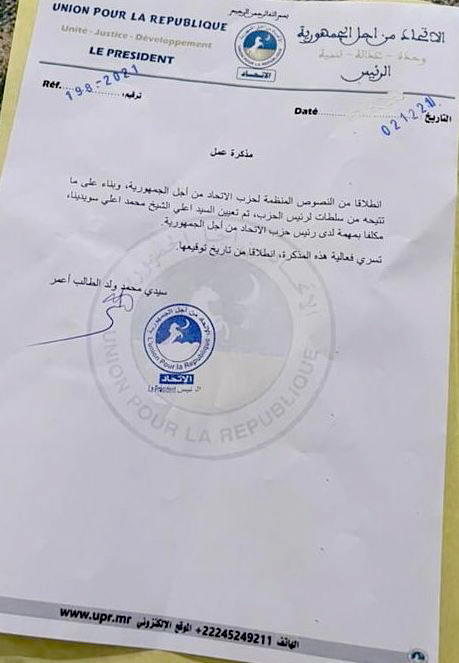 عين رئيس حزب الاتحاد من أجل الجمهورية الحاكم في موريتانيا اليوم الخميس 02-12-2021، الإطار والوجيه أعل الشيخ محمد اعلي اسويدينا، مكلفا بمهمة لدى رئيس الحزب.