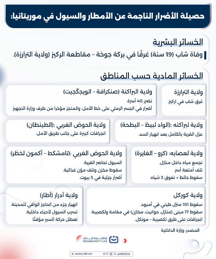 الرئيسية/الإنفوجراف/حصيلة الأضرار الناجمة عن الأمطار والسيول في موريتانيا: حصيلة الأضرار الناجمة عن الأمطار والسيول في موريتانيا: شاركها فيسبوك تويتر لينكدإن طباعة