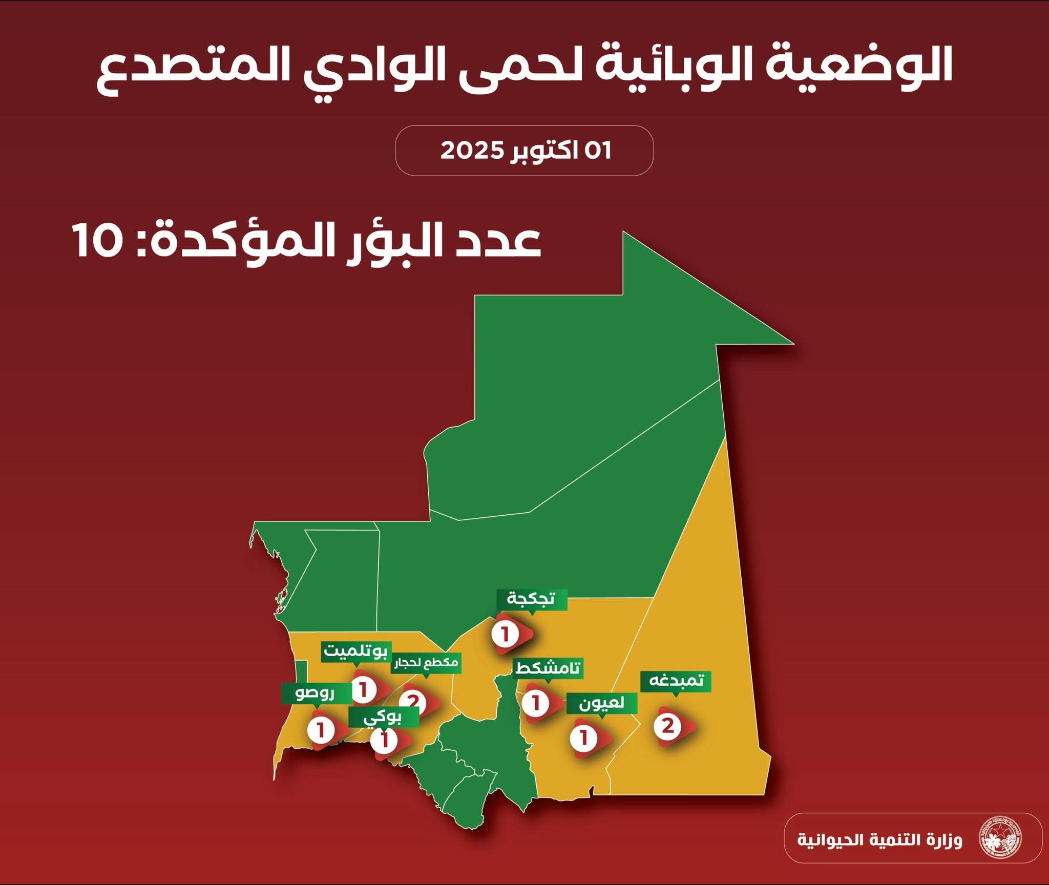 حذرت السلطات الصحية في موريتانيا من موجة تفشّي حمى الوادي المتصدع بعد تسجيل عشر بؤر للمرض في ثماني مقاطعات موزعة على خمس ولايات، منذ اكتشاف أول حالة يوم 15 سبتمبر الماضي في ولاية لبراكنه.