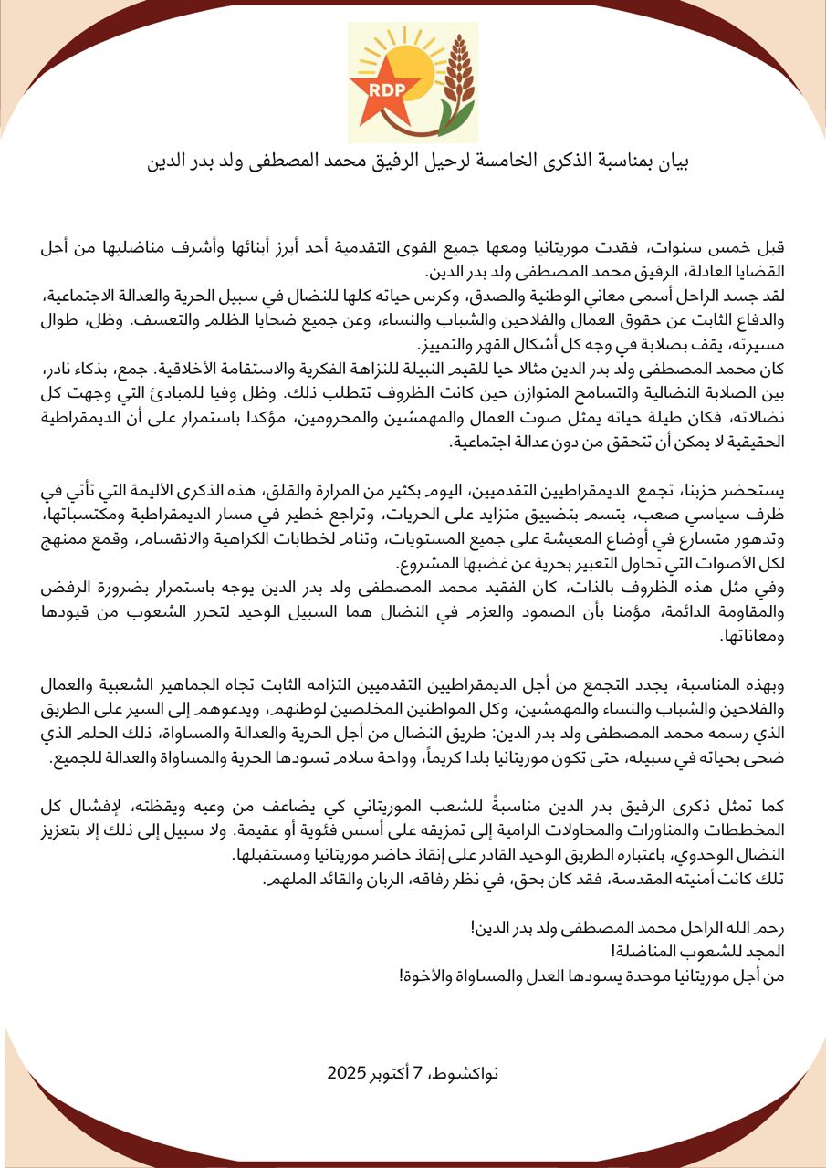 قال حزب تجمع الديمقراطيين التقدميين أن الذكرى الخامسة لرحيل الرفيق محمد المصطفى ولد بدر الدين تأتي في ظرف سياسي صعب يشهد تضييقًا على الحريات، وتراجعًا في مسار الديمقراطية، وتدهورًا في الأوضاع المعيشية، وتصاعدًا لخطابات الانقسام والكراهية.