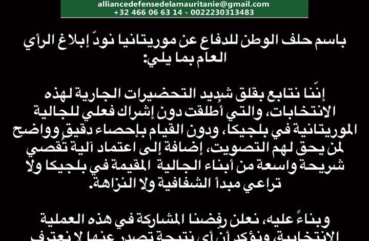 أصدر عدد من أفراد الجالية الموريتانية في بلجيكا بياناً أعلنوا فيه رفضهم للانتخابات التي نُظمت يوم السبت لاختيار ممثل للجالية، معتبرين أنها جرت دون معايير الشفافية والشمول المطلوبة، ولا تعكس الإرادة الحقيقية للموريتانيين المقيمين هناك.