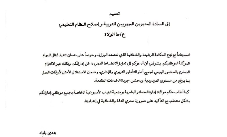 وشددت الوزارة في تعميمها الموجه للولاة على أهمية الالتزام بالشفافية والدقة عند إعداد قوائم الغياب.
