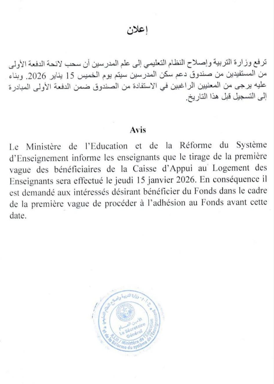 وقالت الوزارة في إعلان نشرته على صفحتها بفيسبوك، إن العملية ستتم يوم الخميس 15 يناير 2026، داعية المدرسين المعنيين إلى التسجيل قبل الموعد المحدد.
