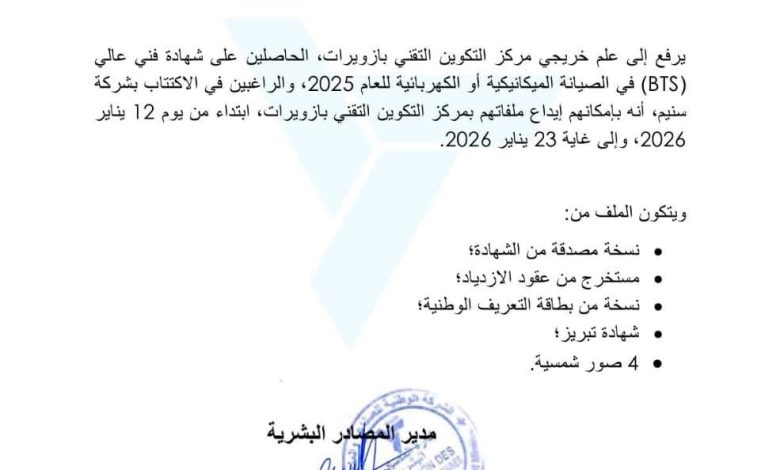 ودعت الشركة المترشحين الحاصلين على شهادة فني عالي (BTS) في تخصصي الصيانة الميكانيكية أو الكهربائية لسنة 2025 إلى التقدم بملفاتهم ضمن هذا الاكتتاب.