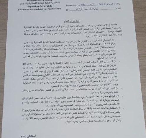نفت المفتشية العامة للإدارة القضائية والسجون في بيان صادر عنها، استهداف القضاة، مؤكدة تمسكها بصلاحياتها في تفتيش محكمة ولاية لبراكنه.