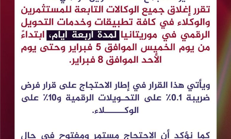 أعلن تجمع نقاط التحويل الرقمي عن الإغلاق الكلي لجميع وكالات ونقاط التحويل الرقمي التابعة للمستثمرين والوكلاء، لمدة أربعة أيام، ابتداءً من يوم الخميس وحتى يوم الأحد، وذلك على امتداد كافة التراب الوطني.