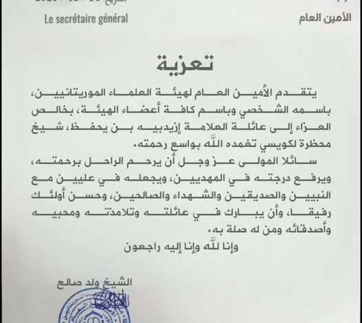 وتقدمت رابطة العلماء الموريتانيين، بخالص تعازينا ومواساتها إلى عائلة الفقيد تغمده الله بواسع رحمته.