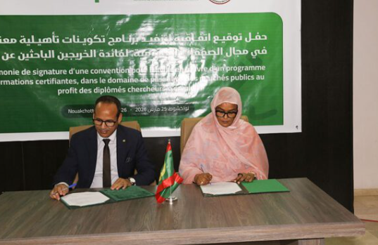 وقّعت سلطة تنظيم الصفقات العمومية، زوال اليوم الثلاثاء في نواكشوط، اتفاقية شراكة مع الوكالة الوطنية للتشغيل، لتنفيذ برنامج تكوين وتأهيل في مجال الصفقات العمومية لصالح الخريجين الباحثين عن عمل.