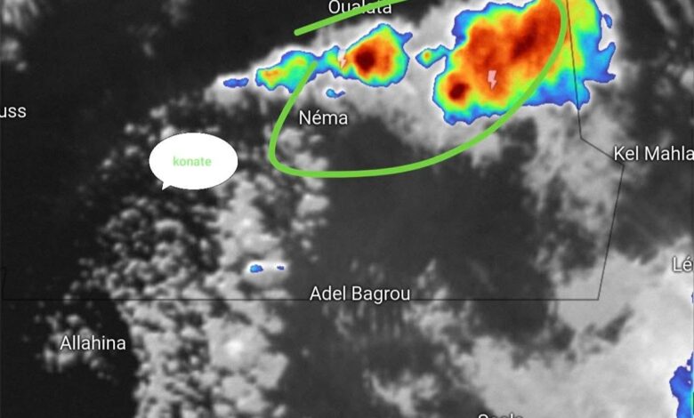 أفاد خبير شؤون الطقس عمر كوناتي بأن السحب التي تشكلت شمال شرق مدينة النعمة، عاصمة ولاية الحوض الشرقي، تحولت إلى سحب رعدية ماطرة معتبرة.