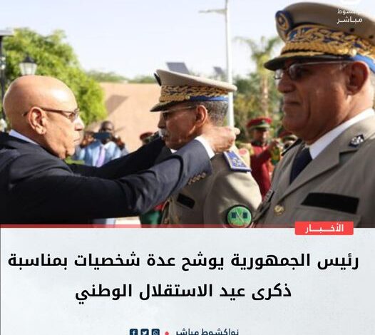 وخلال الحفل وشح رئيس الجمهورية محمد ولد الشيخ الغزواني، صباح اليوم الاثنين بالقصر الرئاسي في انواكشوط، ضمن الفعاليات المخلدة للذكرى الثانية والستين للاستقلال الوطني، الشخصيات التالية: