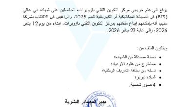 أعلنت إدارة المصادر البشرية في الشركة الوطنية للصناعة والمناجم (سنيم) فتح باب الترشح للاكتتاب أمام خريجي مركز التكوين التقني بمدينة…