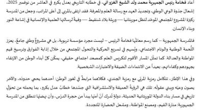 أشاد المجلس الأعلى للتهذيب بالخطاب الذي ألقاه فخامة رئيس الجمهورية السيد محمد ولد الشيخ الغزواني في مدينة عدل بكرو يوم…