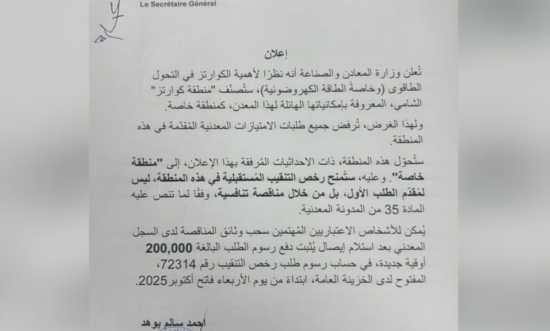 أكمل القراءة »أعلنت وزارة المعادن والصناعة عن تصنيف منطقة الكوارتز بالشامي كمنطقة خاصة. وقالت الوزارة في بيان إن جميع طلبات الامتيازات المعدنية…