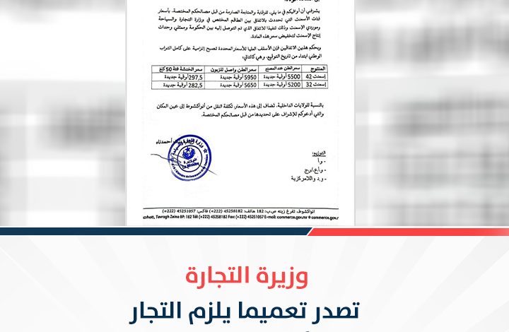 أكمل القراءة »أصدرت وزيرة التجارة والسياحة، زينب بنت أحمدناه، تعميما على الولاة يلزم التجار باحترام أسعار مادة الإسمنت بموجب اتفاق بين الحكومة…